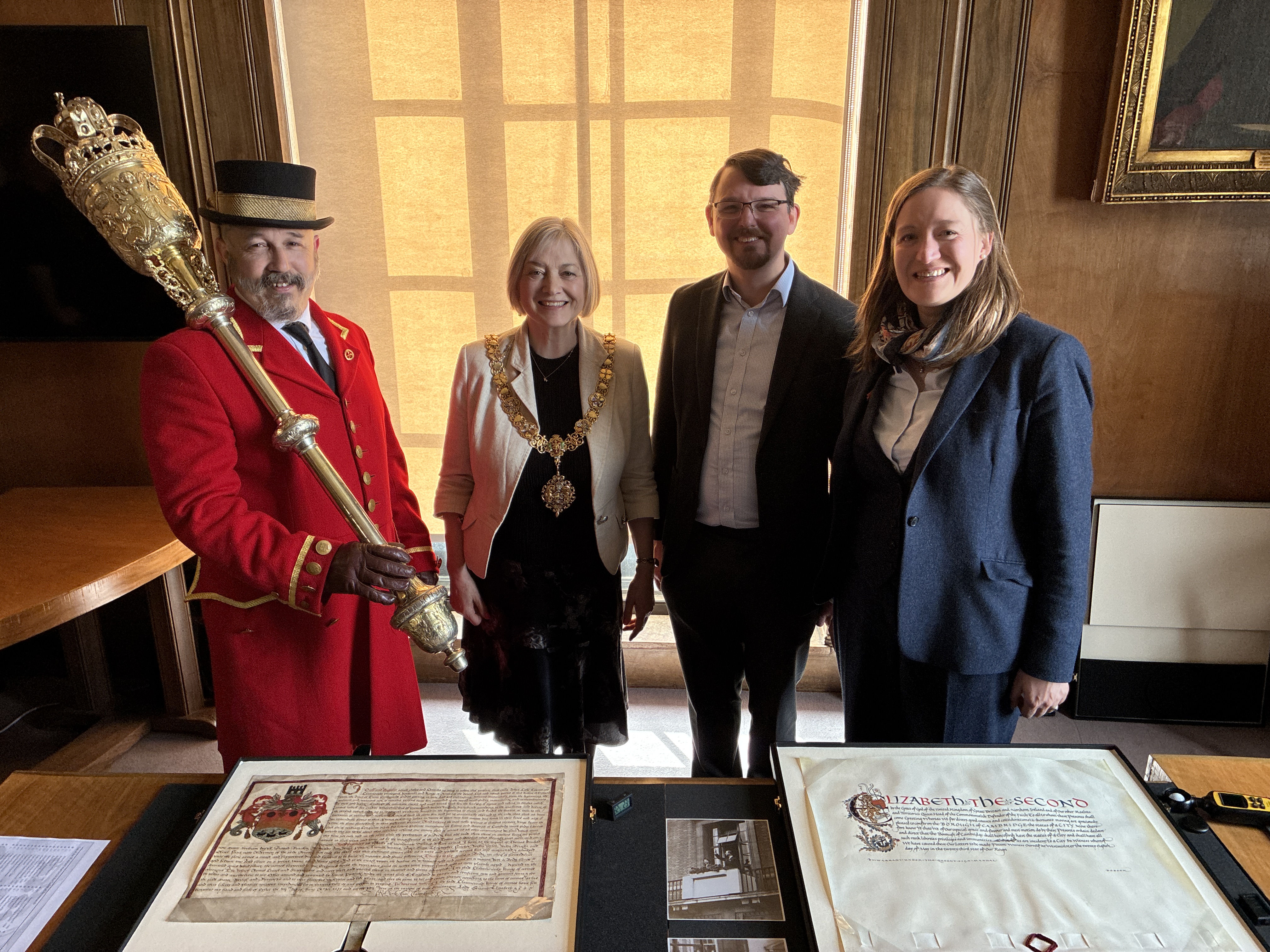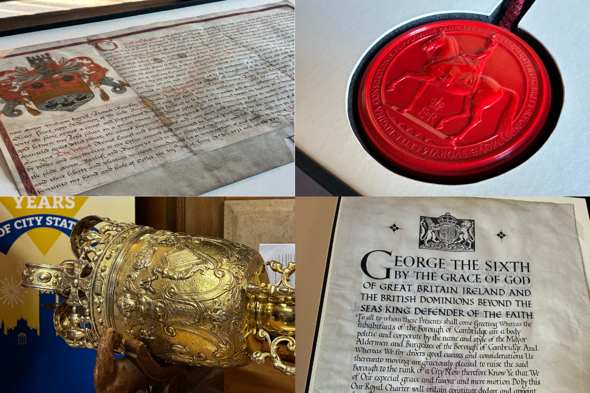 Clockwise from top left: Charter from Queen Elizabeth I in 1589; seal of Queen Elizabeth II; charter granting Cambridge city status in 1951; the city's Great Mace